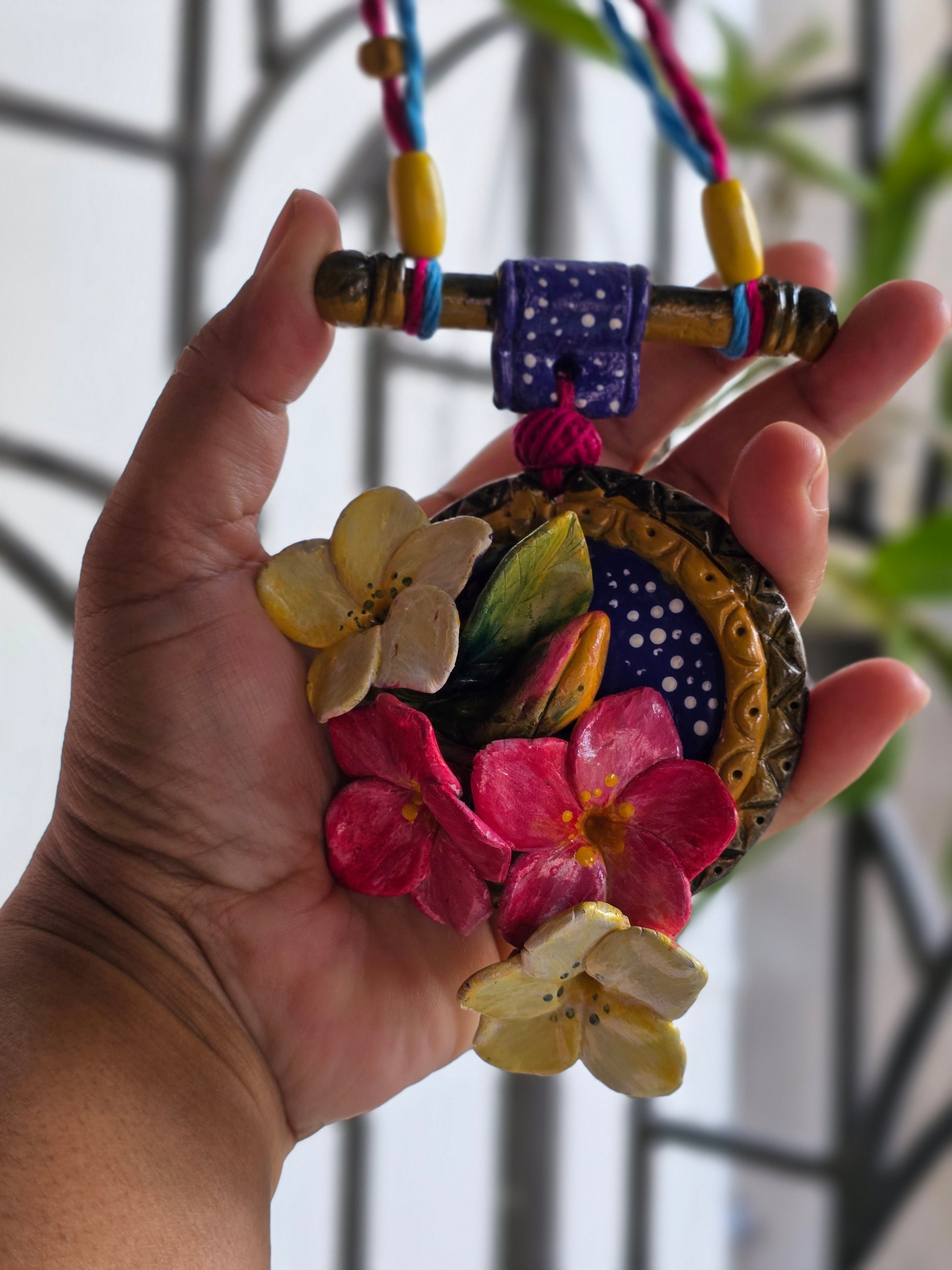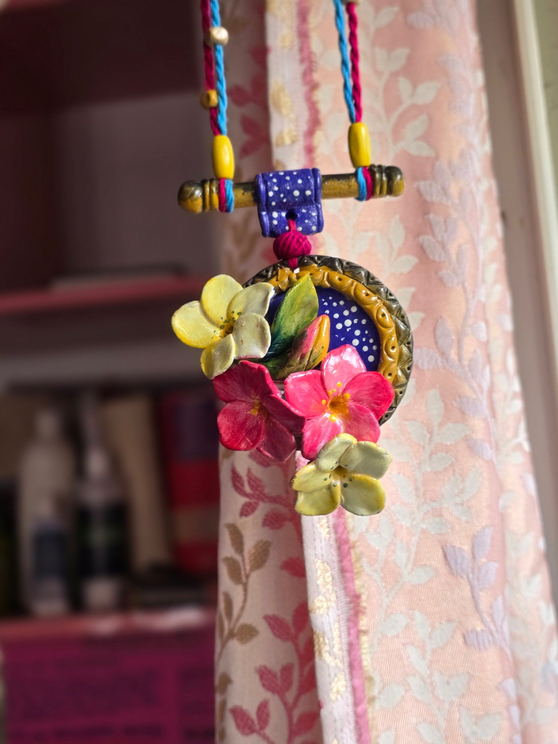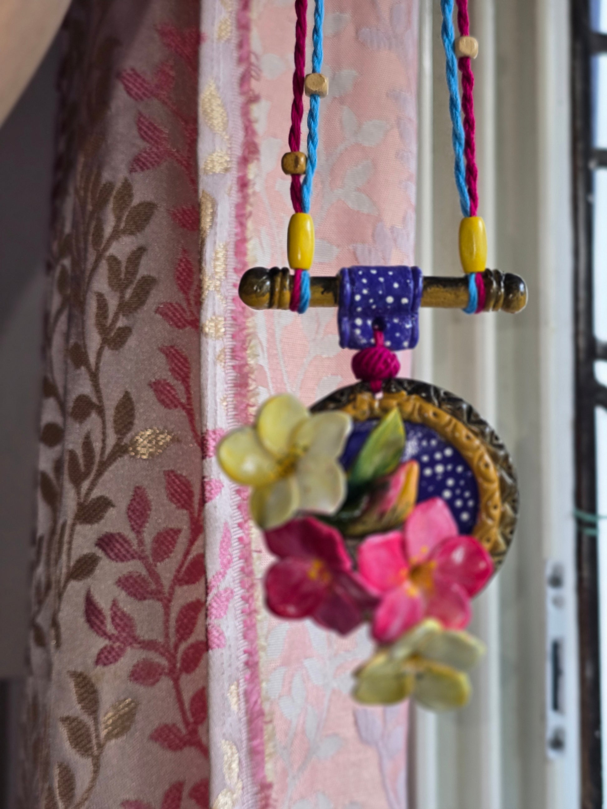 Inspired by the delicate Kathgolap flower, this handcrafted clay pendant brings a soft, graceful charm to your everyday and festive looks.